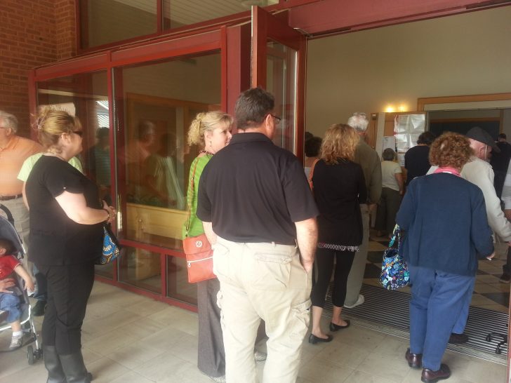Since noon, parking has been limited around city hall, and the lines have stretched out the door as voters patiently wait to cast their ballots.