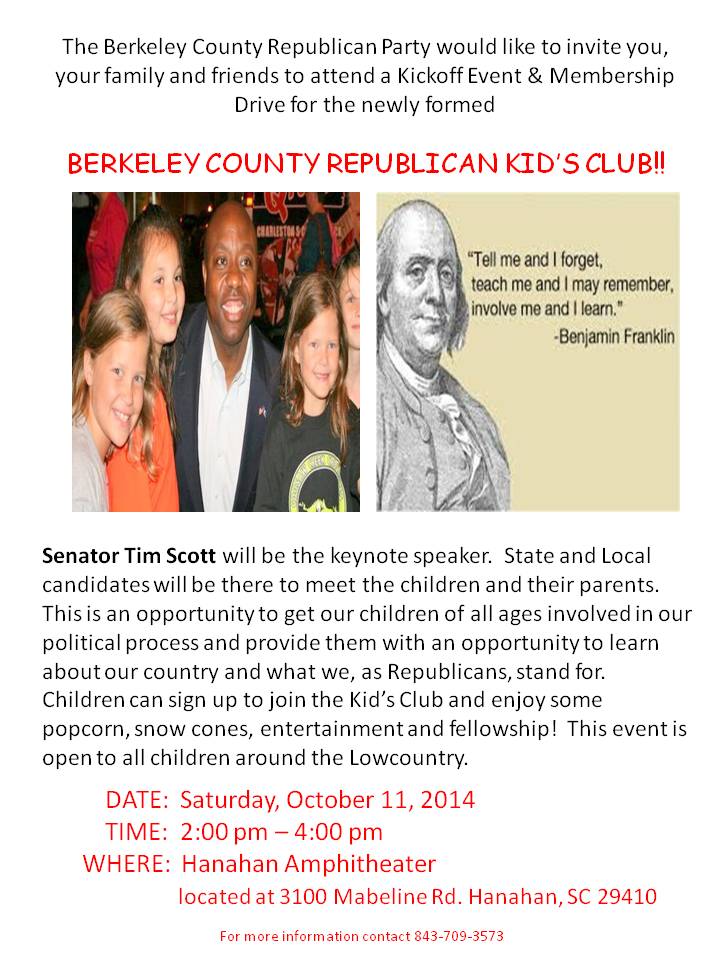 The Republican Kids’ Club kickoff will be held at the Hanahan Amphitheater, 3100 Mabeline Road in Hanahan, from 2:00 pm – 4:00 pm on October 11, 2014.