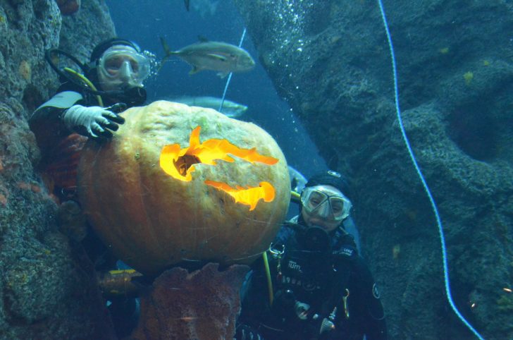 Unlike years past, when divers carved several small pumpkins, divers worked together on Friday to create a massive underwater masterpiece in the Aquarium’s Great Ocean Tank.