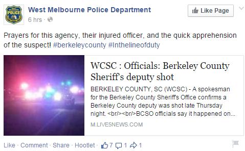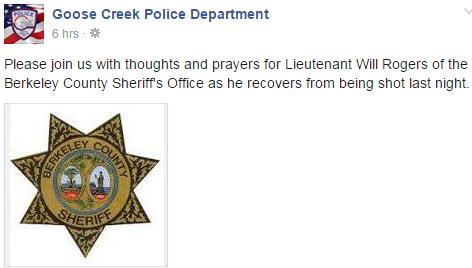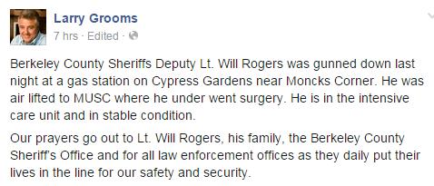 Hours after a masked gunman opened fire on Lt. Will Rogers at a local gas station located at Highway 52 and Cypress Gardens Road, hundreds of people have taken to Facebook and Twitter to show their support to the Berkeley County Sheriff’s Office and the veteran law enforcement officer.