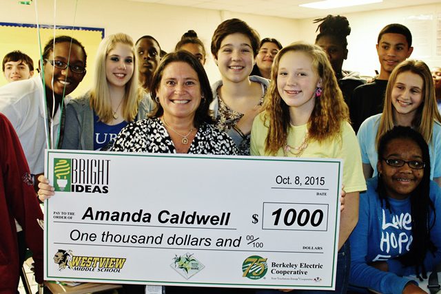 BERKELEY COUNTY, S.C.–Amanda Caldwell, English teacher at Westview Middle School, received a $1,000 Bright Ideas grant from Berkeley Electric Cooperative to create English Interactive Student Notebooks. The grant was awarded as a part of Berkeley Electric Cooperative’s 75 Acts of Education, celebrating the companies 75th year of service to the community.