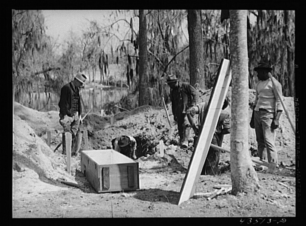 In 1934, South Carolina lawmakers authorized the Santee-Cooper Power and Navigation Project in order to connect the Santee and Cooper rivers as well as generate hydroelectric power. As a result, Lake Moultrie was cleared of stumps, graves, plantations…pretty much EVERYTHING. Water eventually replaced it all and the lakes formed. The project, however, forced many people to move. Needless to say, a lot of people weren’t happy with the loss of their lands seized by eminent domain. Below, these four men attempt to relocate a cemetery that stands in the way of the project.