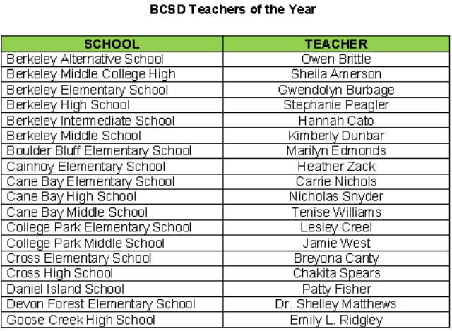 The District Teacher of the Year will be announced during the Teacher of the Year Breakfast, sponsored by the Berkeley Chamber of Commerce, Santee Cooper and Trident Technical College.