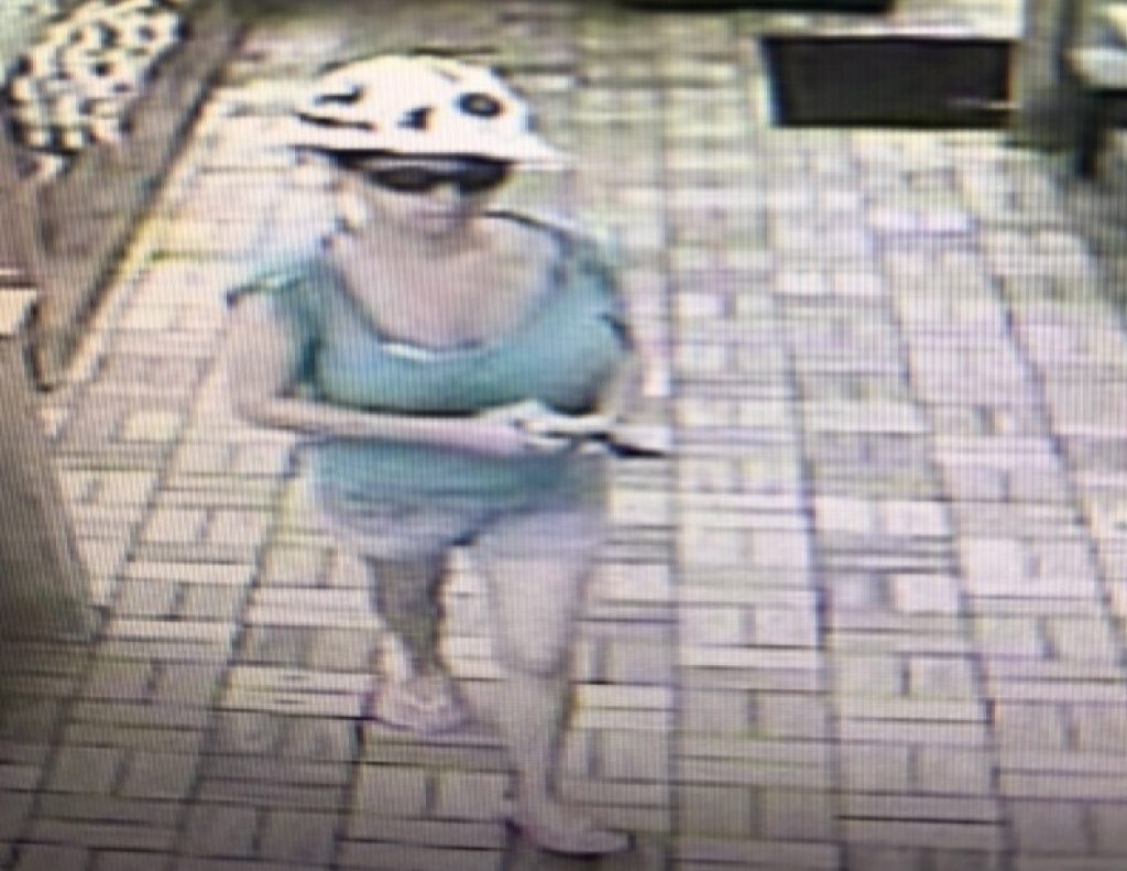 The suspect was reported to have been a white female wearing a blue t-shirt, blue jean shorts, sunglasses, and a white construction hat who presented knives and demanded money.