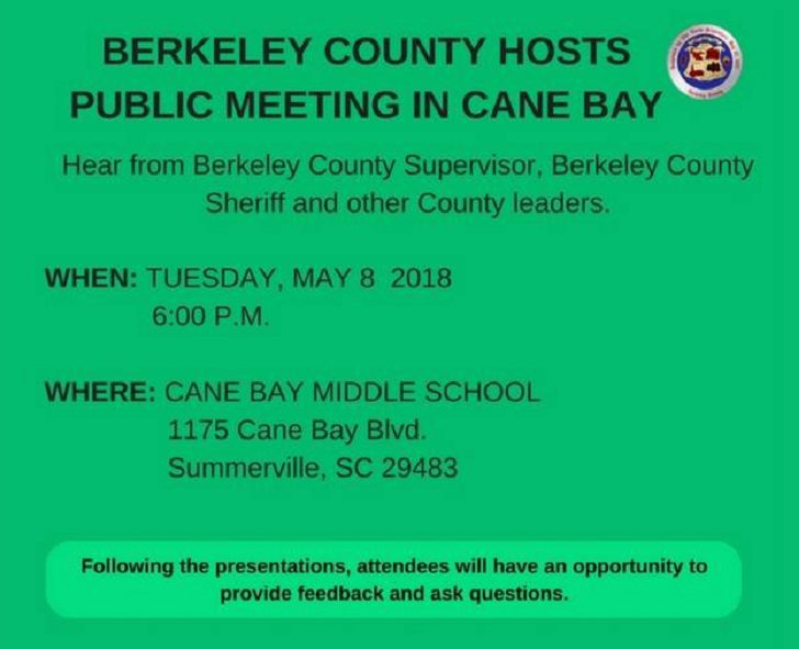 BERKELEY COUNTY, S.C.–Berkeley County will host a community meeting on Tuesday, May 8, 2018, at Cane Bay Middle School, from 6 p.m. – 8 p.m.