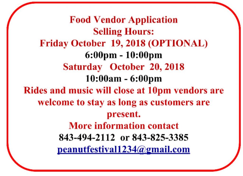 If you have any questions please call (843) 825-3385 or (843) 494-2112. You can also send an email to: peanutfestival1234@gmail.com.
