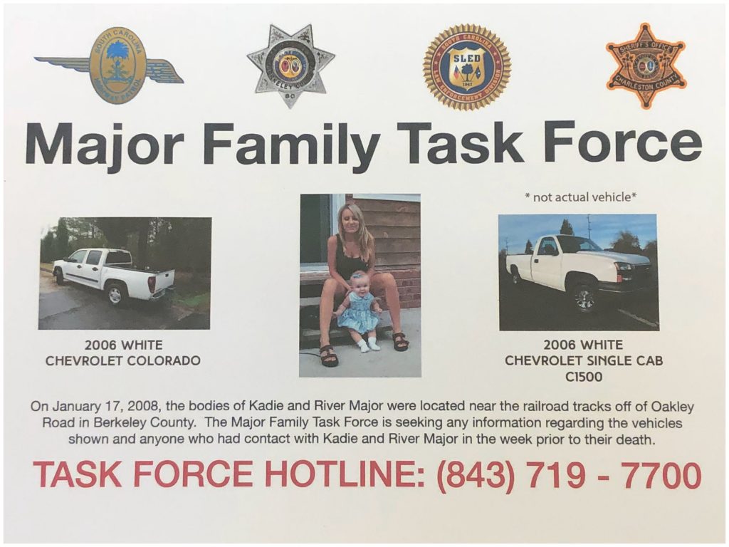 On January 17, 2008, the bodies of Kadie and River Major were located near railroad tracks off of Oakley Road in Berkeley County.