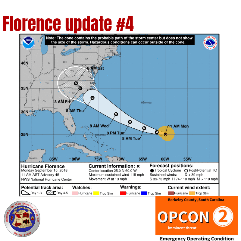 BERKELEY COUNTY, S.C.–In preparation for Hurricane Florence, Berkeley County’s Emergency Operations Center (EOC) moved to OPCON 2 at 12 p.m. Monday, September 10, 2018.