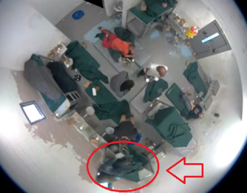 The video shows one of the inmates kicking out the window of the cell before exiting.