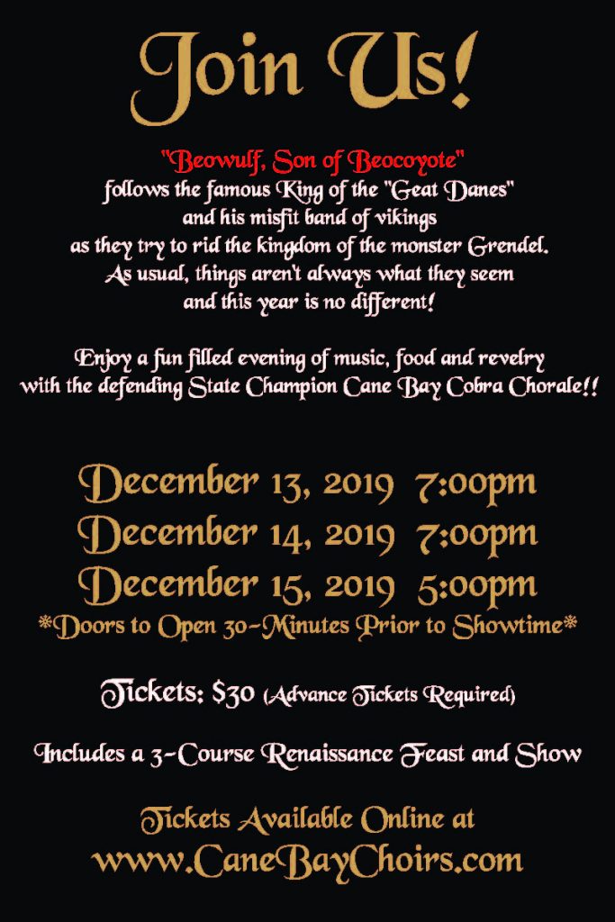 This year’s show is entitled “Beowulf, Son of Beocoyote” which follows the famous King of the “Geat Danes” and his misfit band of Vikings as they try to rid the kingdom of the monster Grendel. As usual, things aren’t always what they seem and this year is no different! Enjoy a fun-filled evening of music, food and revelry with the defending State Champion Cane Bay Cobra Chorale!!
