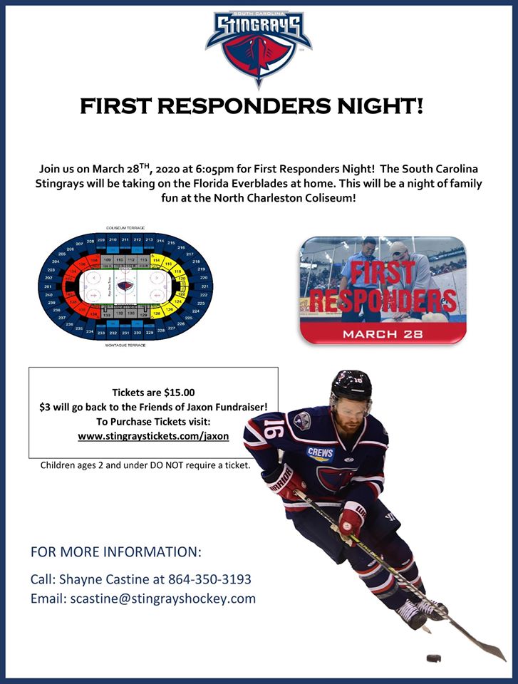 On March 28, the South Carolina Stingrays will host First Responders Night. Tickets are $15 and three dollars of each ticket will benefit Jaxon’s recovery. Tickets can be purchased at this link. Additional details can be found on this flyer: