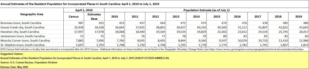 Bonneau was the only municipality in Berkeley County to experience a slight decrease in growth, largely remaining steady. The U.S. Census Bureau reported the town’s population as 487 in 2010. Last year, the agency reported the town’s population as 486, a .21 percent decrease.