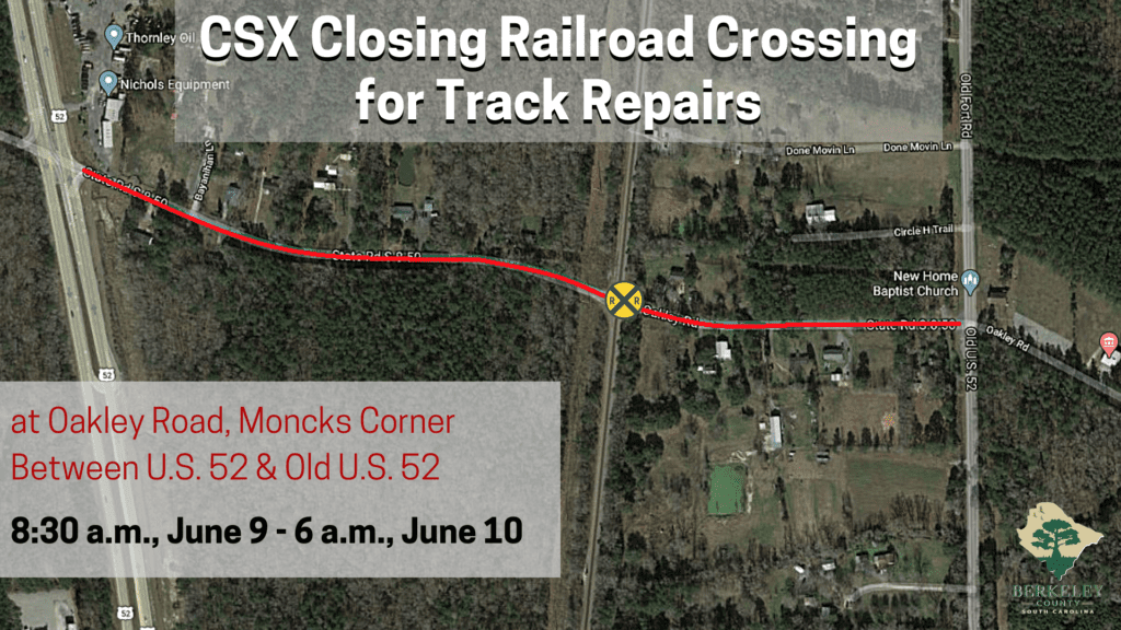 BERKELEY COUNTY, S.C. – CSX is scheduled to close the railroad crossing at Oakley Road, between Highway 52 and Old Highway 52 in Moncks Corner, starting at 8:30 a.m. on Tuesday, June 9 to repair a portion of the track.
