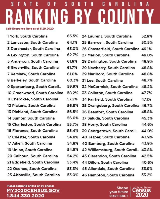 The good news is Berkeley County appears to be doing better than many other South Carolina counties. According to the U.S. Census Bureau, Berkeley County ranks #8 in the state for census completion. As of May 29, 60.3 percent of people have completed the census.