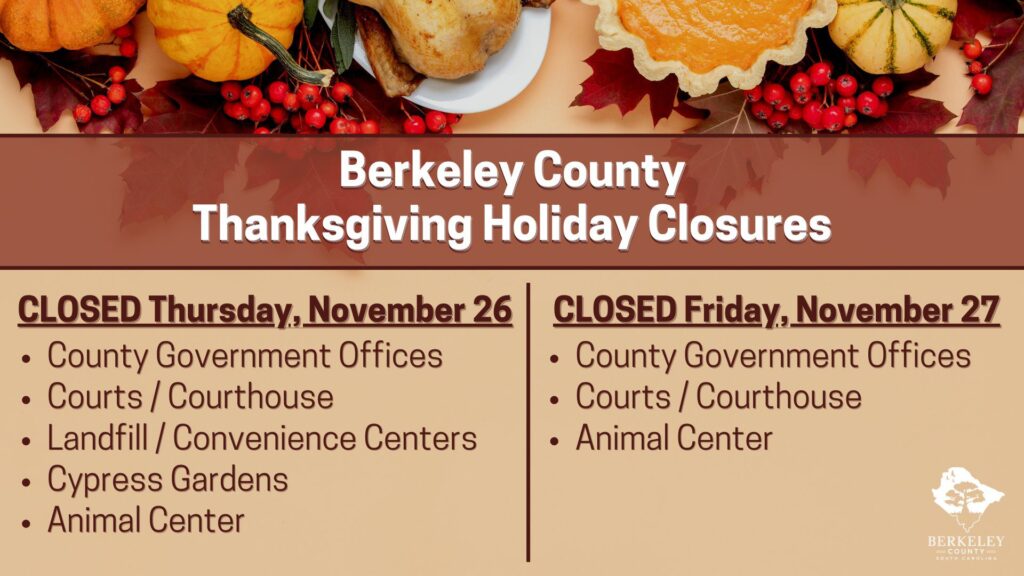 BERKELEY COUNTY, S.C. – With the Thanksgiving holiday fast approaching, many government facilities will not be open to the public.