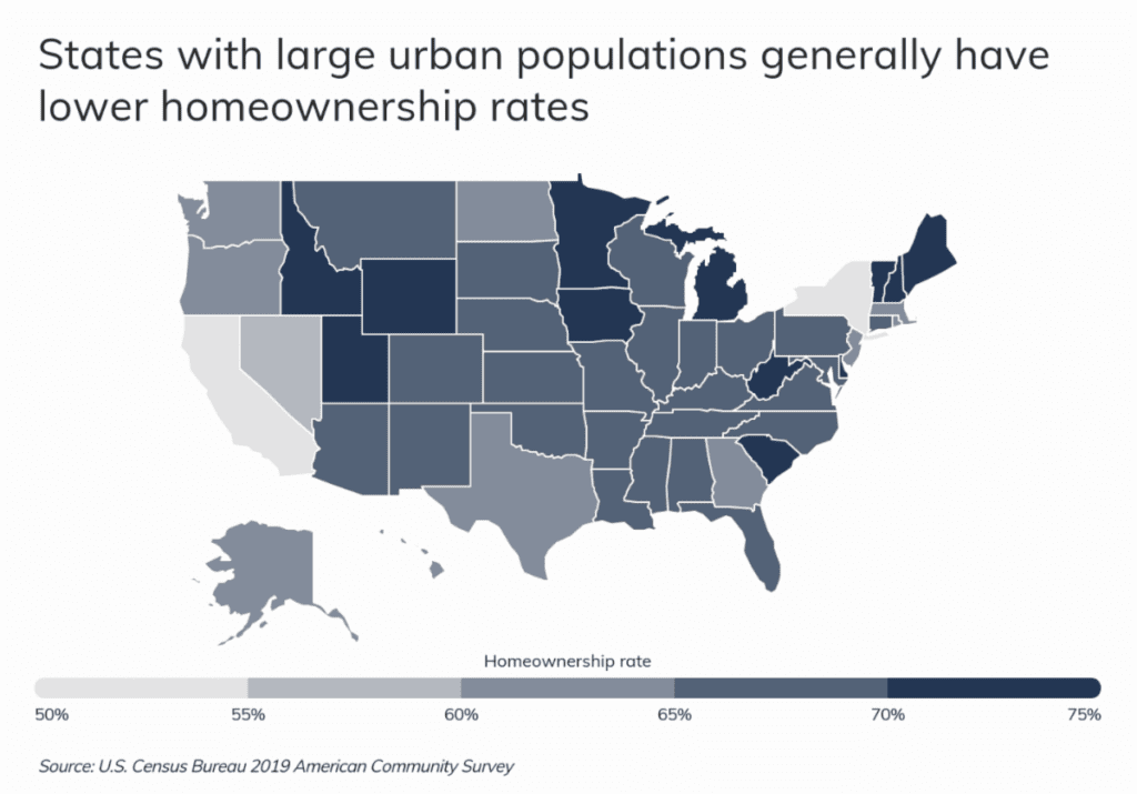 As a result of geographic differences across these factors, homeownership rates vary significantly by location. At the state level, homeownership rates range from a low of 53.5% in New York to 73.4% in West Virginia. In general, coastal states with expensive and densely populated urban areas, such as New York and California, tend to have some of the lowest homeownership rates in the country. By contrast, many states in the Midwest such as Minnesota and Wyoming are known for their affordable housing, and tend to have higher homeownership rates.