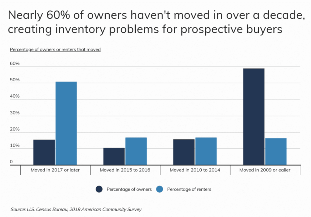 Prospective home buyers face many challenges, including a lack of inventory and rising prices, which is keeping homeownership rates low in certain areas. Many older homeowners don’t want to move, which limits available options for first-time buyers. According to data from the U.S. Census Bureau, about 60 percent of current homeowners bought their home in 2009 or earlier and haven’t moved since. By contrast, about half of current renters moved into their current residence in 2017 or later.