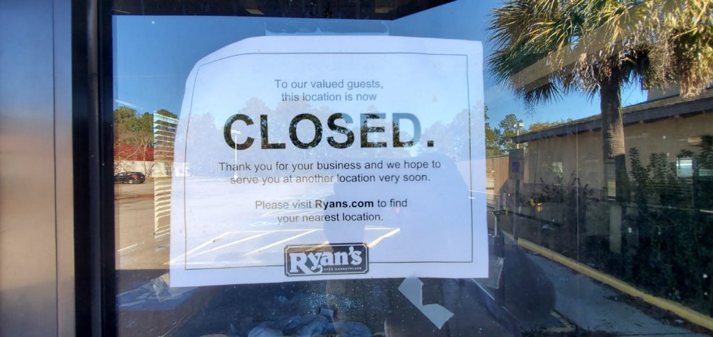 Outside of the former Ryan’s, a buffet-style restaurant located at 1314 North Main St., hangs a sign that reads, “To our valued guests, this location is now closed. Thank you for your business, and we hope to serve you at another location very soon.”