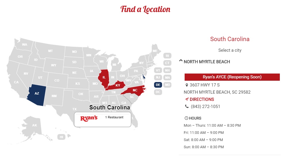 According to the chain’s website, the nearest and only Ryan’s restaurant remaining in South Carolina is in North Myrtle Beach; however, it is temporarily closed for business.