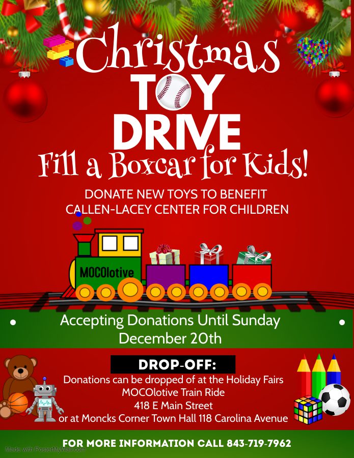 MONCKS CORNER, S.C. – The Town of Moncks Corner is currently collecting toys for the Callen-Lacey Center for Children as part of “Fill a Boxcar for Kids.”