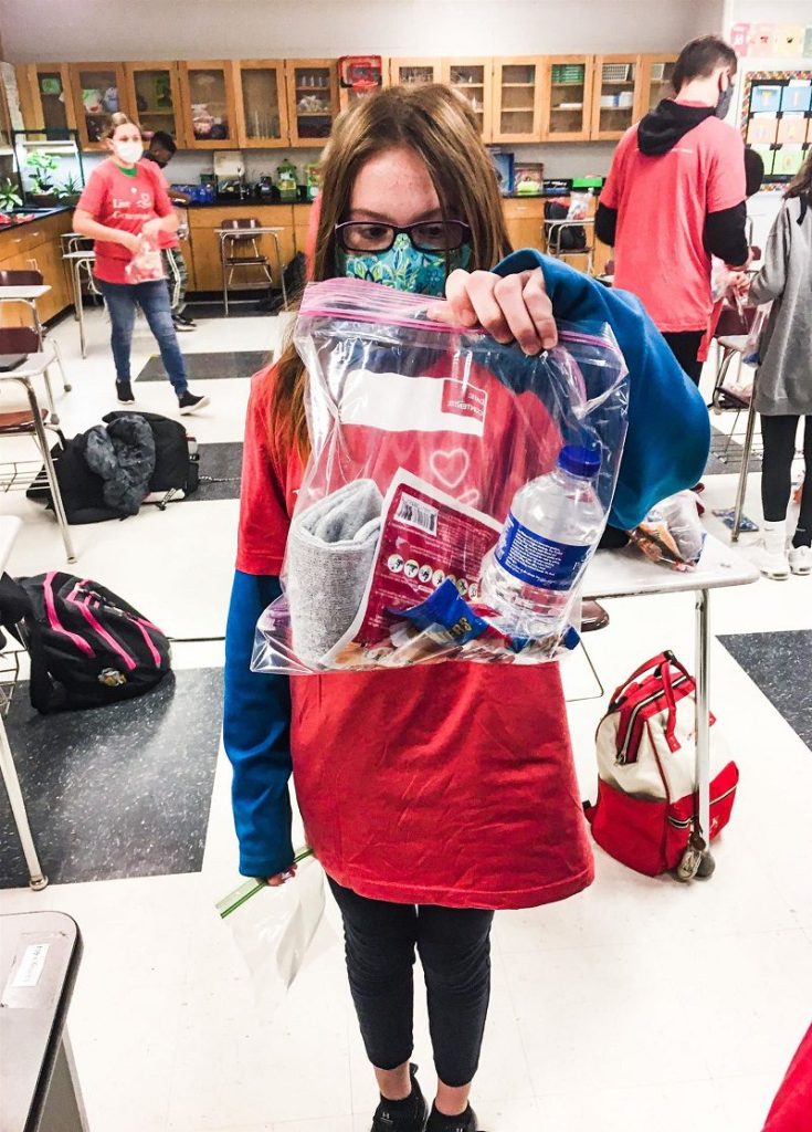 His homeroom class then assembled the bags. Each bag includes a toothbrush, toothpaste, crackers, a bag of M&Ms, mints, a pair of socks, a small water bottle, a Slim Jim, baby wipes and handwarmers.
