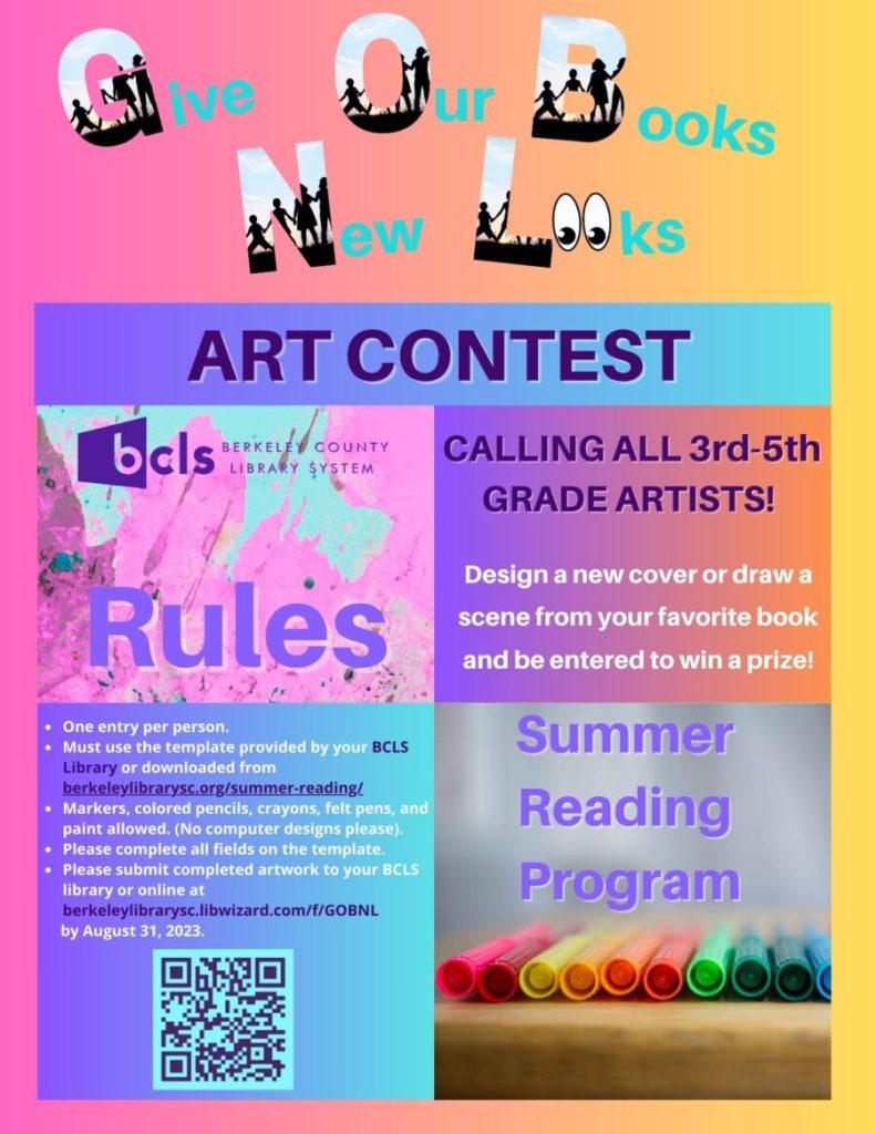The Summer Reading Program also includes Give Our Books New Looks Art Contest for third-fifth grade students to design a cover or draw a scene from a favorite book at Rules and Template for a prize drawing! Participants are encouraged to use markers, colored pencils, crayons, felt pens, and paint and complete all fields on template. Computer-designed artwork is not encouraged. Deadline to submit completed artwork to a BCLS location or online at berkeleylibrarysc.libwizard.com/f/GOBNL is August 31, 2023. One entry per person.