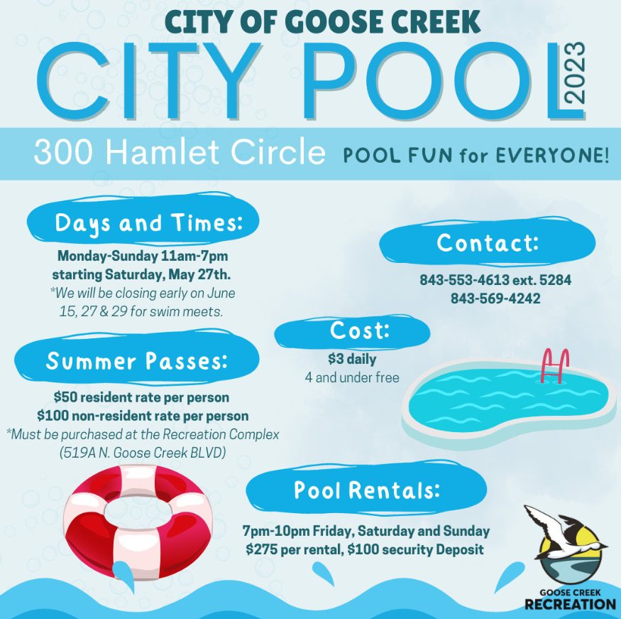 GOOSE CREEK, S.C. – Looking to cool off this summer? The city pool in Crowfield is now open through Labor Day weekend, Goose Creek officials announced.
