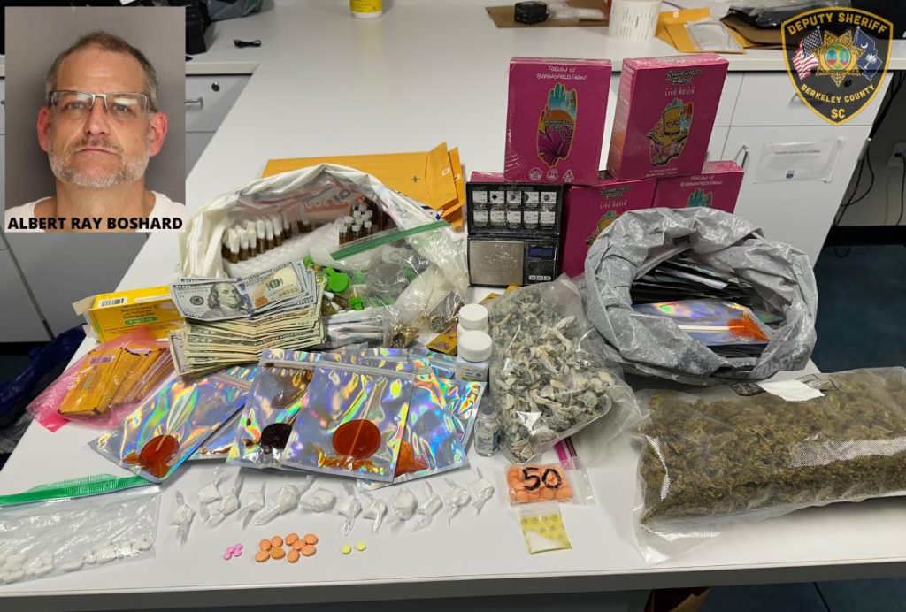 BERKELEY COUNTY, S.C. – A repeat drug offender is facing new charges following a recent traffic stop in Berkeley County. Berkeley County deputies recently arrested Albert Ray Boshard Jr., 54, for trafficking cocaine, possession with the intent to distribute methamphetamine, possession of a scheduled narcotic with the intent to distribute, possession of a controlled substance, and possession of Schedule IV narcotics with the intent to distribute.