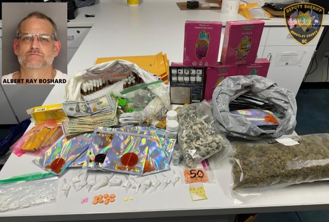 BERKELEY COUNTY, S.C. – A repeat drug offender is facing new charges following a recent traffic stop in Berkeley County. Berkeley County deputies recently arrested Albert Ray Boshard Jr., 54, for trafficking cocaine, possession with the intent to distribute methamphetamine, possession of a scheduled narcotic with the intent to distribute, possession of a controlled substance, and possession of Schedule IV narcotics with the intent to distribute.