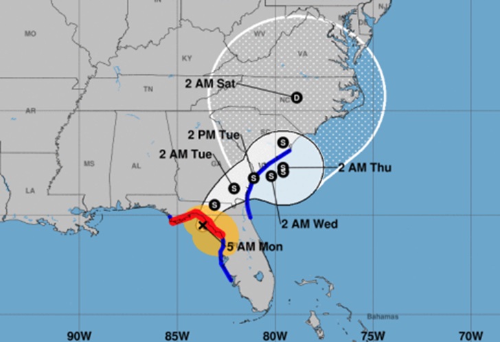 Tropical Storm Watch means tropical storm conditions (sustained winds of 39 to 73 mph) are possible within 48 hours. Storm Sturge Warning means there’s a danger of rising water reaching inland areas within 36 hours.