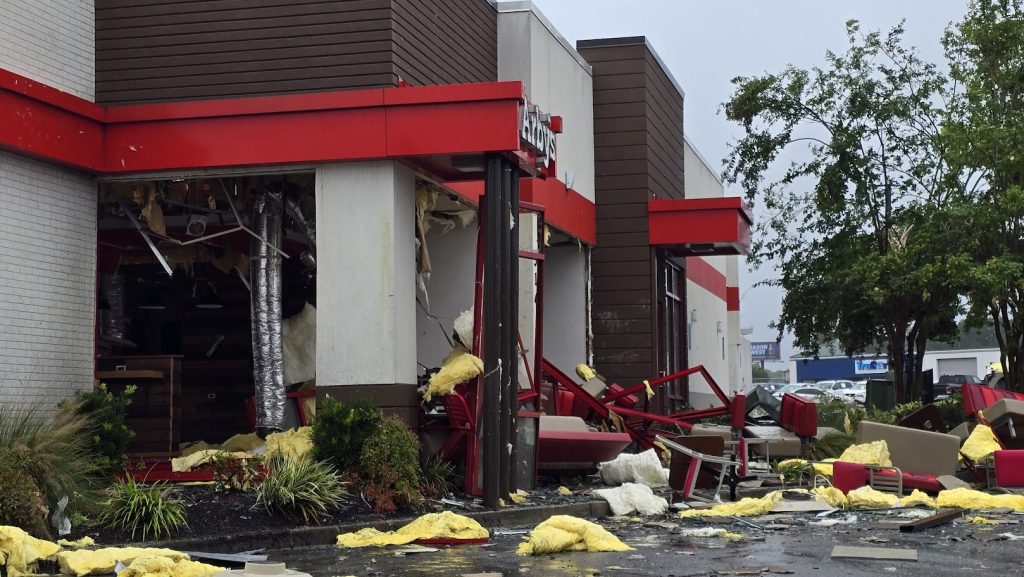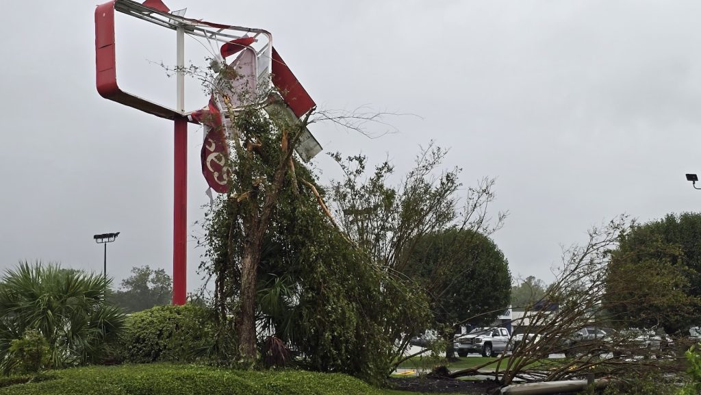 Across the street from the Arby’s, Applebee’s also sustained wind damage. Several light poles were blown over and multiple trees were knocked down. Gusty winds also destroyed the restaurant’s signage.