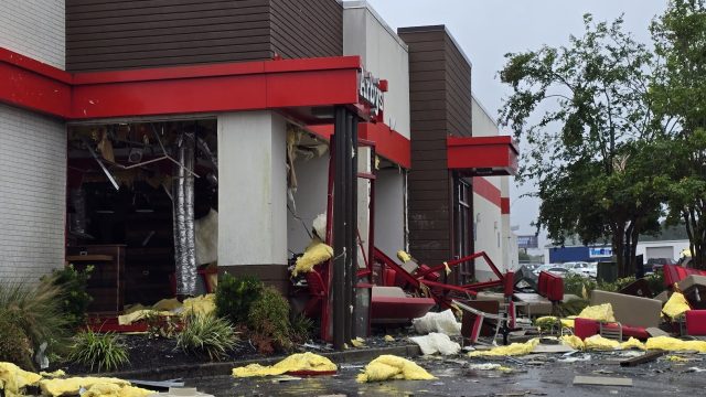 Next to the dealership is Arby’s, which sustained significant damage. Windows were blown out and the strong winds carried some of the dining room into the parking lot.