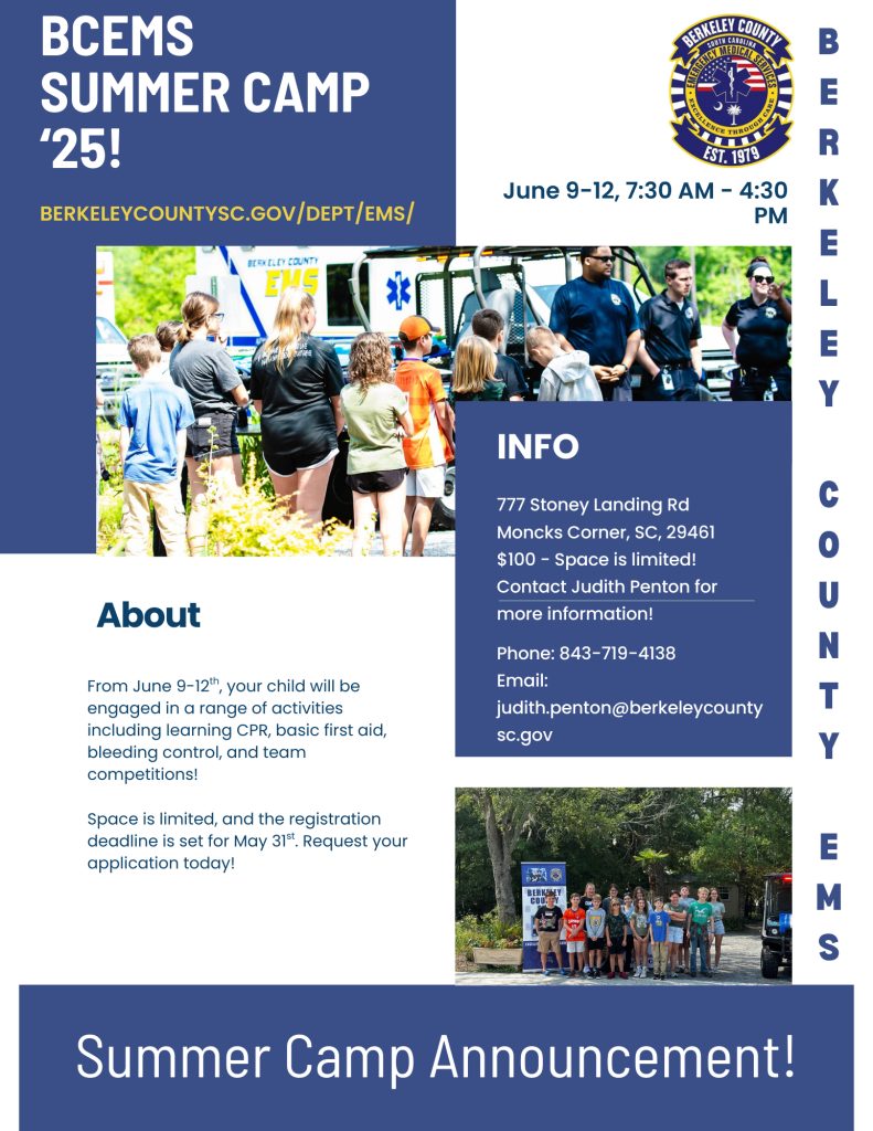 BERKELEY COUNTY, S.C. – Parents looking for a fun, educational, and action-packed summer activity for their kids are in luck. Berkeley County Emergency Medical Services (EMS) is hosting a 4-day EMS Summer Camp designed specifically for children aged 11 to 14, blending hands-on emergency training with engaging outdoor fun.