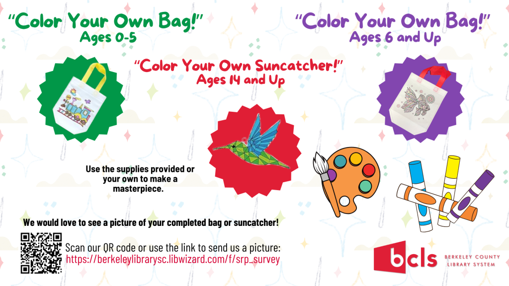 BERKELEY COUNTY, S.C. – Berkeley County Library System (BCLS) is kicking off Summer Reading 2025 with a burst of color and creativity. Starting now, families can pick up free “Color Your Own Bag!” and “Color Your Own Suncatcher!” kits at any BCLS location, while supplies last.
