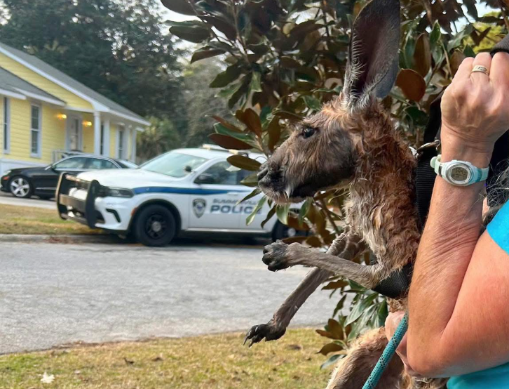 The Summerville Police Department said the animal was reported by a neighbor who noticed the marsupial bouncing around their property. Officers arrived on scene and engaged in a brief pursuit, which ended with the young kangaroo leaping into a backyard pool.