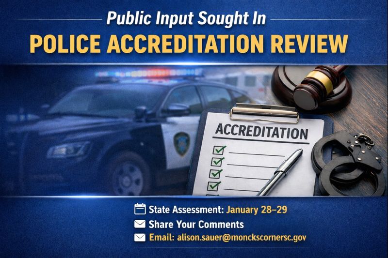 MONCKS CORNER, S.C. – The Moncks Corner Police Department will undergo an on-site assessment January 28–29, 2026, as part of the state accreditation process conducted by South Carolina Law Enforcement Accreditation, Inc., town officials recently announced.