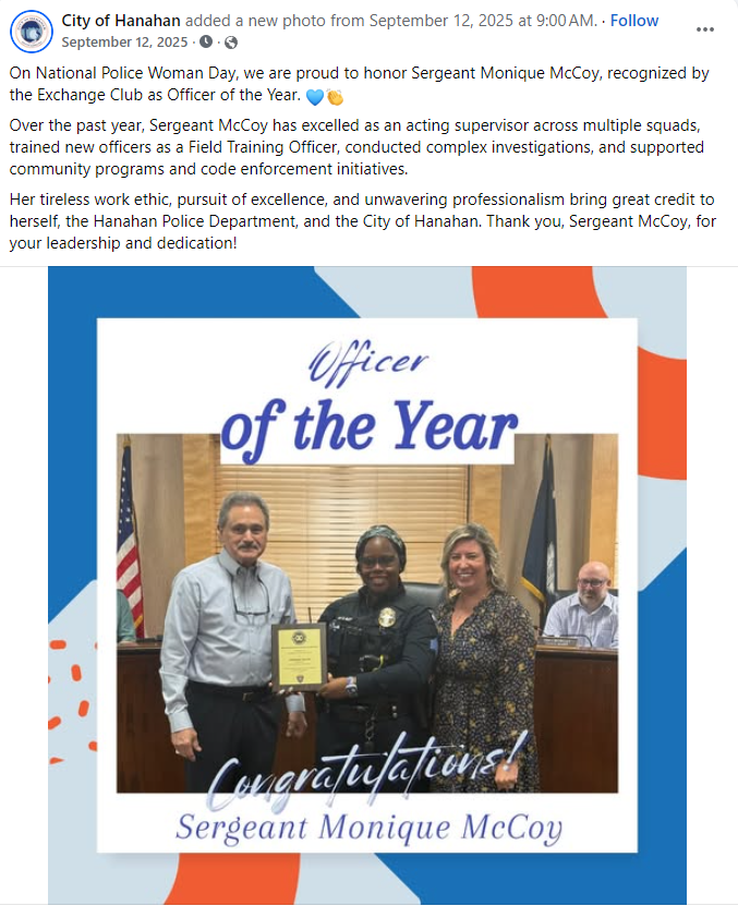 “Over the past year, Sergeant McCoy has excelled as an acting supervisor across multiple squads, trained new officers as a Field Training Officer, conducted complex investigations, and supported community programs and code enforcement initiatives,” the post reads. “Her tireless work ethic, pursuit of excellence, and unwavering professionalism bring great credit to herself, the Hanahan Police Department, and the City of Hanahan. Thank you, Sergeant McCoy, for your leadership and dedication!”