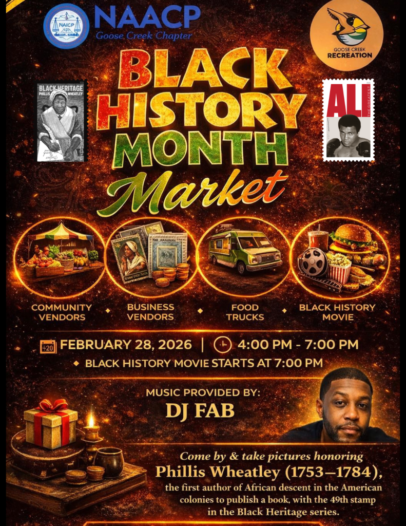 The organization, in partnership with Goose Creek Recreation, will host a Black History Month Market on Saturday, Feb. 28, from 4 p.m. to 7 p.m. The event is designed to highlight local entrepreneurs, bring families together and honor Black history and achievement.