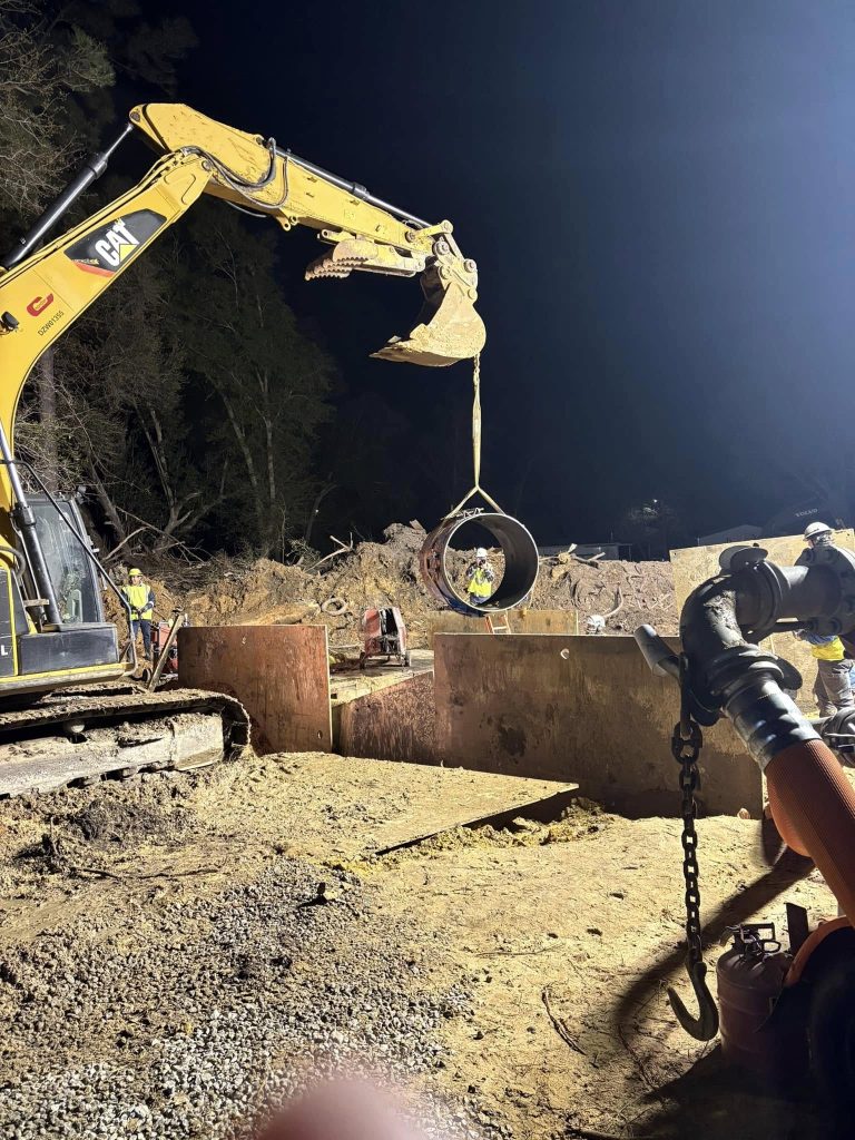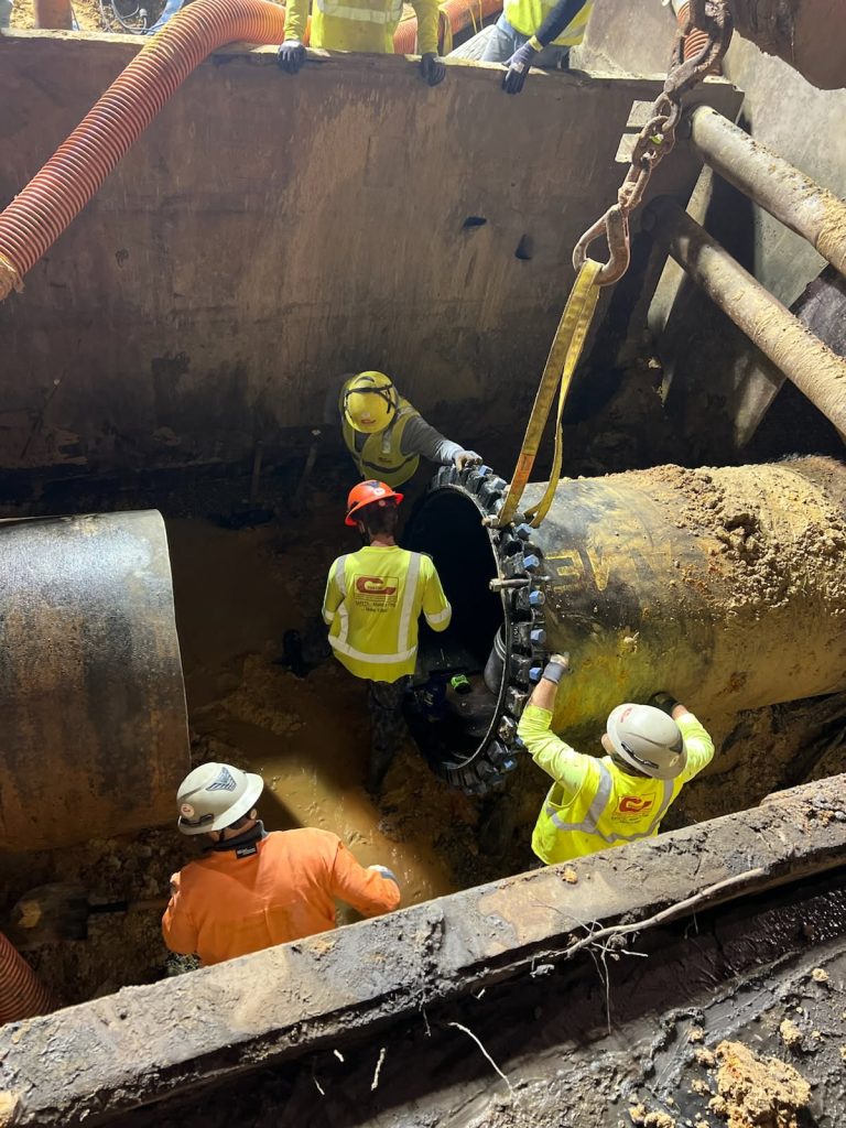 Crews worked through the night to complete repairs, a process that involved draining the pipe, removing the damaged section and installing a replacement.