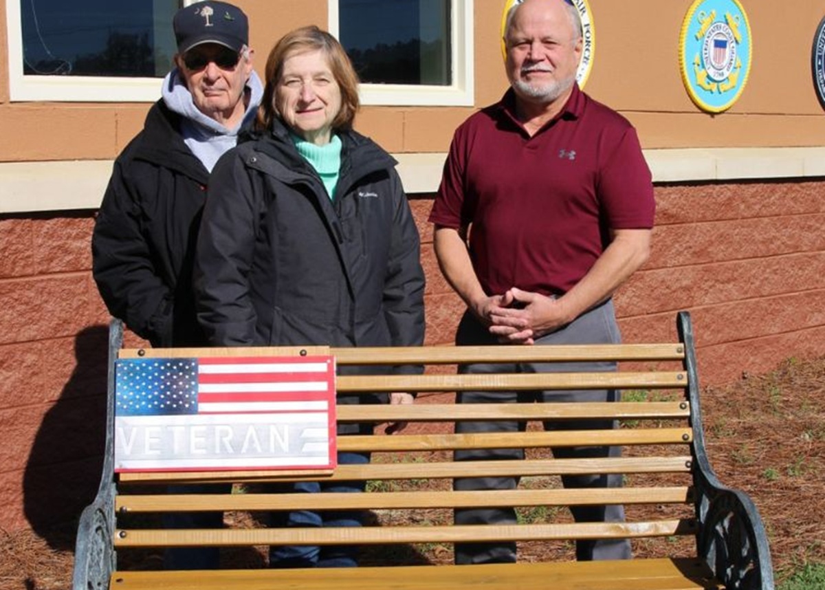 According to county officials, army veteran Bernard Bolduc and his wife, Shirley, recently took it upon themselves to restore a worn bench outside the VA office on Oakley Plantation Drive — replacing damaged wood and installing a new American flag placard, along with donating a second for future use.