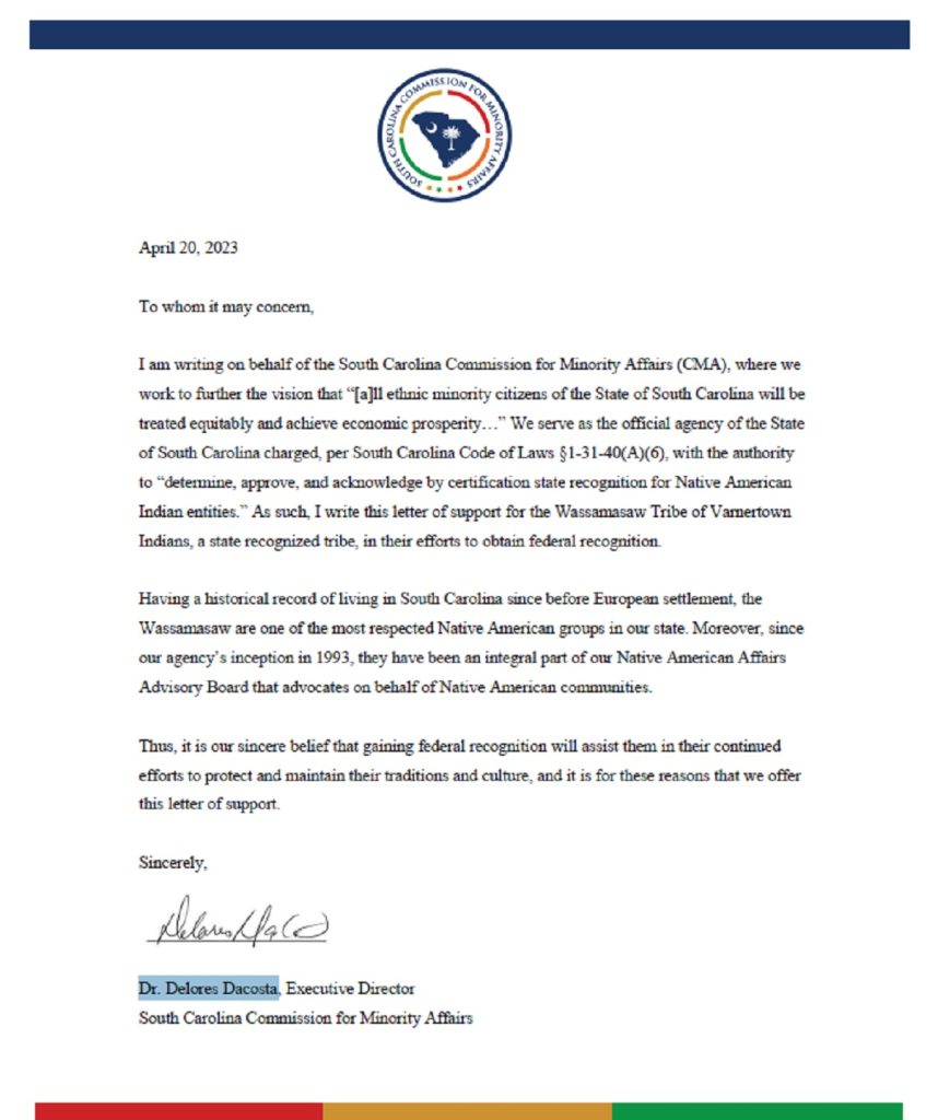 South Carolina Commission for Minority Affairs Letter Supporting Tribe’s Federal Recognition
